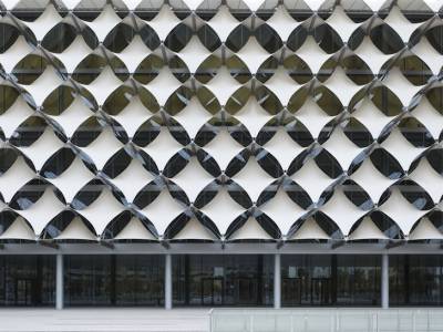 Изогнутый, белый фасад, обеспечивает визуальный интерес и защиту от солнца, сохраняя при этом максимальное проникновение света.