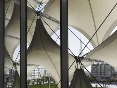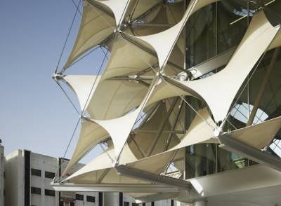 Каждое тефлоновое покрытие мембрана из ткани стекловолокна прикреплена к сетке предварительно напряженных кабелей из нержавеющей стали и расположены в традиционной арабском шаблоне. Ночью, здание оживает как "культурный маяк города", как изменение цвета светового шоу освещает белый фасад ткани.