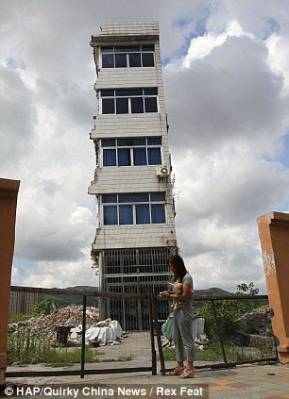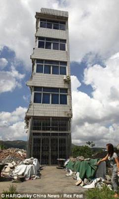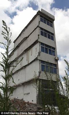 Многоквартирный дом до конца не разрушили, помешала последняя жительница. Стойкий Чжэн отказалась переезжать из своего дома, который находиться в провинции Чжэцзян, Китай, чтобы освободить место для строительства новой площадки, потому что она была несогласная с суммой компенсации, которую ей предлагают.