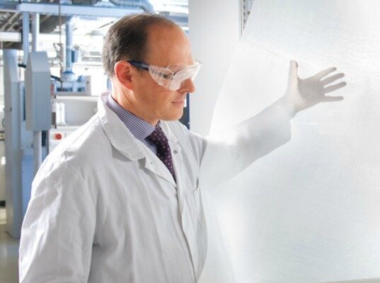 Эти сильные и жесткие стеклянные волокна переплетены для создания прочной и эластичной панели. Волокна перекрестное в различных направлениях, поэтому они оба сильные и гибкие, что позволяет покрытию распространять энергию равномерно во время землетрясения. Чтобы стены стояли в случае сейсмической активности, не достаточно клеит стандартные обои, поэтому КИТ начал работать с подразделение компании Bayer MaterialScience для повышения продукта.