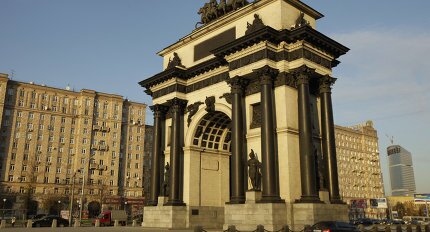 Первая (деревянная) Триумфальная арка, предназначенная для торжественного въезда в Москву русских войск, которые возвратились из Западной Европы после победы над Наполеоном, была сооружена в 1814 году на месте коронационных ворот Павла I (современная Триумфальная площадь). Деревянная постройка быстро обветшала, и в 1826 году вступивший на престол император Николай I пожелал выстроить каменную Триумфальную арку перед Тверской заставой, при въезде в столицу. В 1829 - 1834 годах под руководством главного архитектора Москвы Осипа Бове, который сам был участником Отечественной войны 1812 года, арка была выстроена, Бове умер незадолго до ее торжественного открытия. В качестве образца архитектором использовались триумфальные арки Древнего Рима. Все скульптуры были отлиты из чугуна по уникальной технологии, секрет которой в настоящее время утрачен, и покрыты специальным составом, подчеркивавшим декоративно-пластические качества скульптуры.