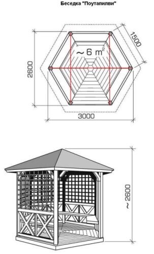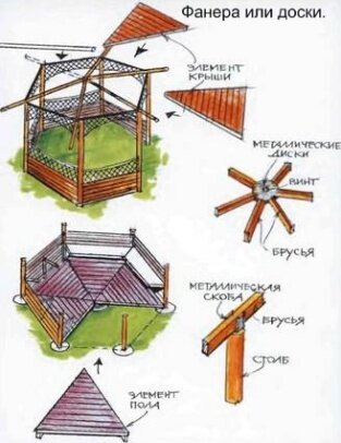 Оптимальная высота беседки, сделанной своими руками от свеса кровли до пола — 2.2-2.5 м: Полом может служить утрамбованная земля, гравийно-песчаная смесь, газон, мостовые плитки или деревянный настил (который укладывают на бетонное основание с устройством гидроизоляции из полиэтиленовой пленки). Кровлю для легких деревянных беседок делают из ткани, мелких древесных кровельных материалов (гонта, стружки и драни) и вьющихся растений, плотно обвивающих деревянный каркас, а для прочных и основательных сооружений — из шифера, листового или гофрированного металла. Строительство беседки своими руками начинают с выбора и подготовки площадки. Готовятся ямы под опорные столбы. Подготовленные сголбы ставятся в ямы и фиксируются на высоте 1,3—1,5 метра между собой поперечными планками. Это должно быть сделано до заливки в ямы бетона. После этого опорные столбы окончательно фиксируются заливкой бетона.