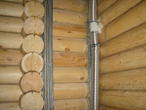 Переходы проводов между стенами должны осуществляться только в металлических трубах. Это необходимо для того чтобы провода не сдавливались из-за осадки дома и не могли быть перекушены грызунами.