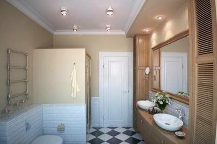 Допустим, что у вас подвесной потолок в ванной комнате, тогда рекомендуется повесить на потолке специальный фонарь и тем самым создать витраж, делающий атмосферу комнату изысканной и уютной. Когда площадь помещения вообще маленькая, то основным освещением здесь могут служить галогенные светильники, расположенные по периметру потолка. Благодаря наличию подвесного потолка вы можете скрыть внутри нее всю электрическую проводку.
