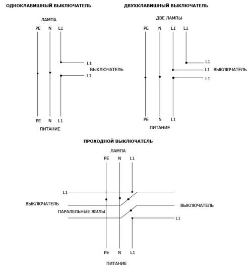 Схема расключения проходного выключателя показана на данной схеме:
