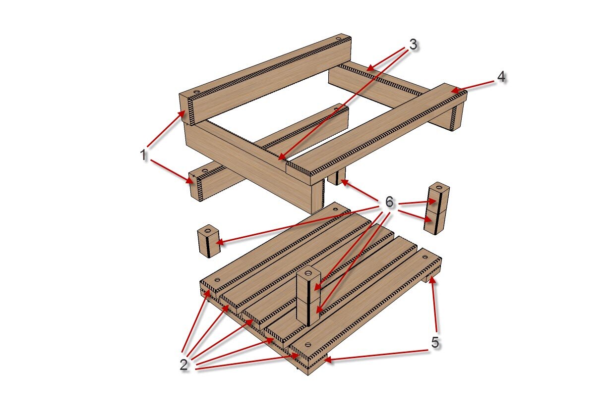 • Черновая торцовка для элементов планки боковины 3, планки под сиденье 5 (кратные), планок передней 4, спинки 1 и сиденья 2: брус распиливается в нужный размер с припуском по длине 15÷30 мм.