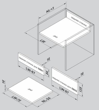 NL - длина направляющих с боковой стенки. Минимальный внутренний размер по корпуса по глубине NL+3 мм