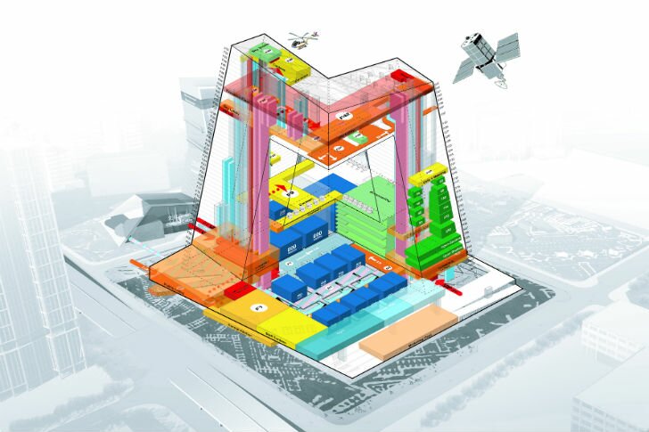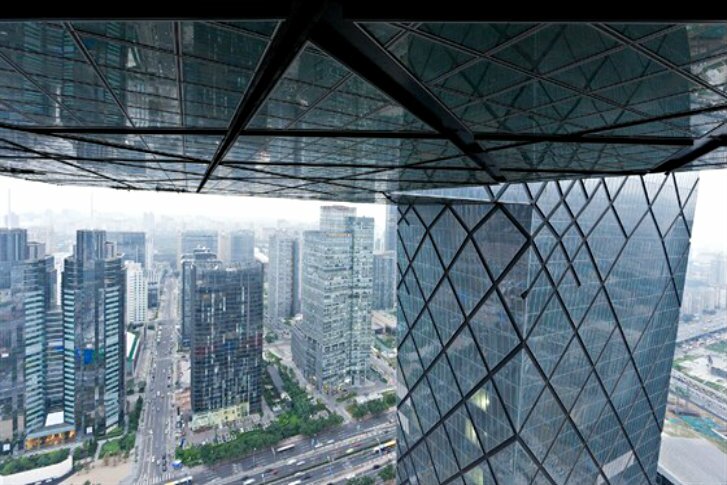 Сложенные башни небоскреба Рема Колхаса объединяет Центральное телевидение Китая в один многоцелевой объект. Одна башня обеспечивает пространство для производства и вещания, а другой используется для услуг, научных исследований и образования.