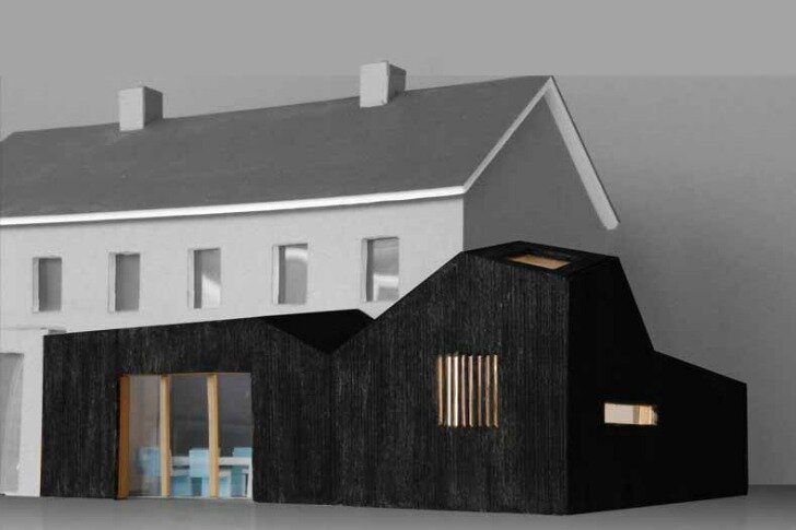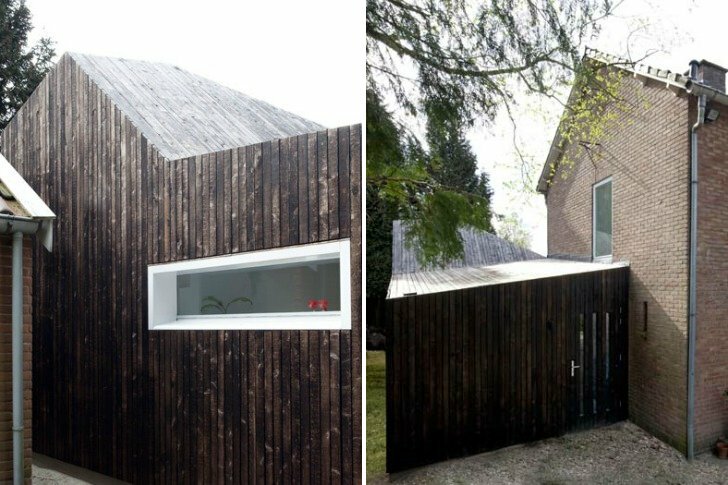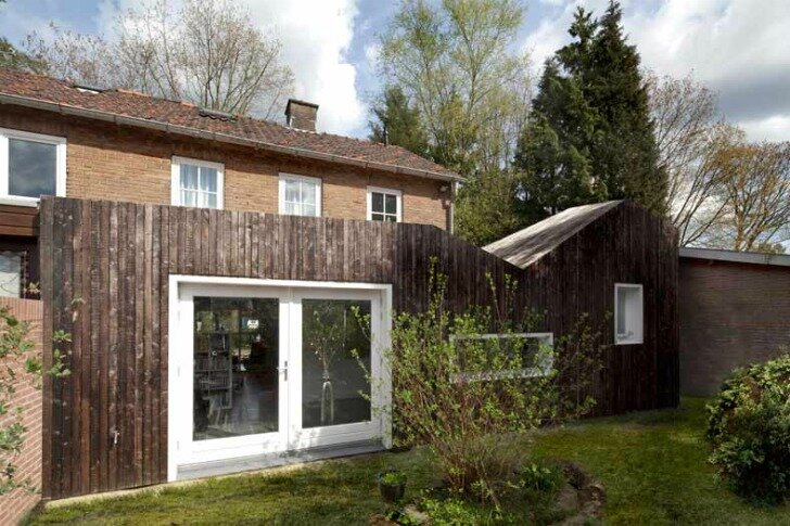 Владельцы этого кирпичного дома 1950-х в Нидерландах захотели расширить и создать пространство для новой кухни, подвала и обеденной зоны, но они не хотели грубый прямоугольный объем, так что они наняли архитекторов BYTR, чтобы разработали интересное пространство, которое должно иметь преимущество самим видом. Фасад дома обит обгорелым деревом (лес).