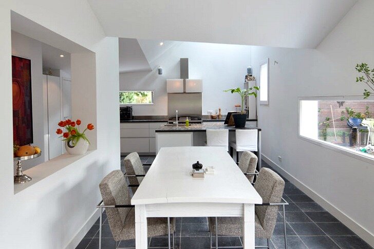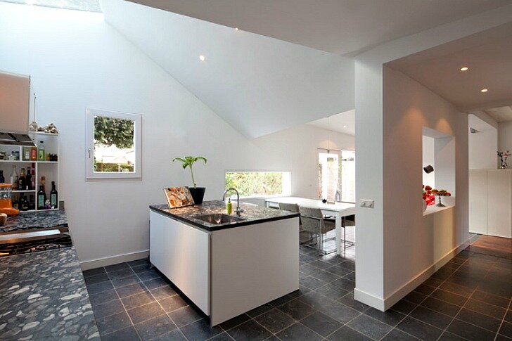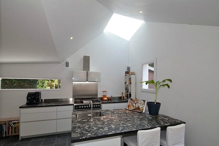 Объем и форма были определены внутренними функциями, и окно были установлены так, чтобы обеспечивать свет и виды из специфических точек зрения. Верхний свет в самой верхней точке затопляет кухню с естественным дневным светом, и растянутое окно на обратной стороне обеспечивает панорамный вид сада.
