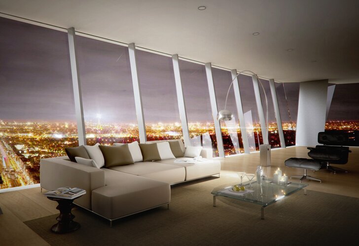 Стратегия основного дизайна поворот плиты перекрытия здания. Масштаб проекта позволит полностью реализовать вертикальный город, который будет не только магнитом для большего города, но и позволит жителям иметь доступ ко многим услугам, необходимым под одной крышей.