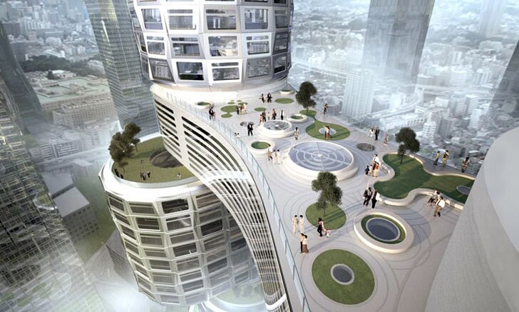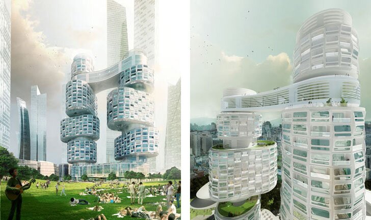 Asymptote Architecture предлагает интересную альтернативу типовых проектов небоскребов, напоминающих вращающиеся детали на машине. Оба интерьера жилого и внешнего фасады были разработаны для постройки с использованием сборных деталей. СкайБридж, который расположен на 30 этаже над землей, будет содержать общие удобства для отдыха, включая фитнес-центр и сад.