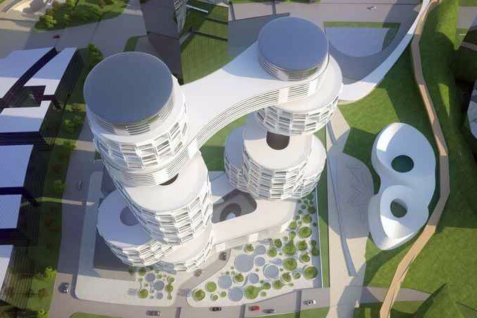 Вело башни от Asymptote увенчаны зелеными крышами и связанны СкайБриджом+видео