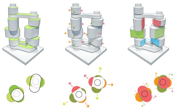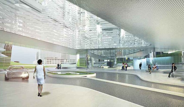 "Разбив масштаб c двумя различными башнями во взаимосвязи с круглыми и продолговатыми объемами, проект Velo предлагает альтернативные архитектурные и градостроительные ответы на повторяющиеся в монолитной строгости обычной конструкции башни", объясняет Asymptote Architecture. "Рекомбинации типичной форма башни в новые горизонтальные и вертикальные конфигурации позволяет формировать социально и привлекательным динамический экологический ответ".