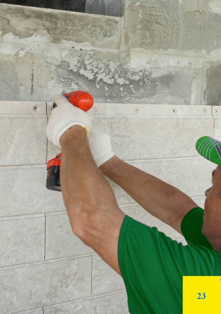 Данный вид отделочного камня специально адаптирован для отделки ячеистых бетонов. Сайдинг можно монтировать как на сухую, используя для крепления шурупы по дереву/рис.23/, , так и с использованием клеящих составов, для придания большей жесткости и удобства монтажа. Между облицовкой и пенобетонной кладкой вентилируемый зазор при отделке фасада специально оставлять не нужно – он формируется за счет оригинальной конструкции сайдинга.